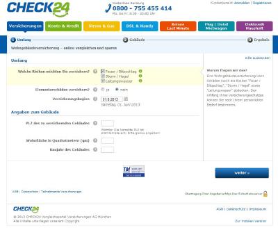 Wohngebäudeversicherung online vergleichen Bei Anbietern wie Check24 lassen sich individuelle Versicherungsvergleiche zum Thema Wohngebäude-Versicherung anfordern (Screenshot comparison.check24.de am 08.05.2013)